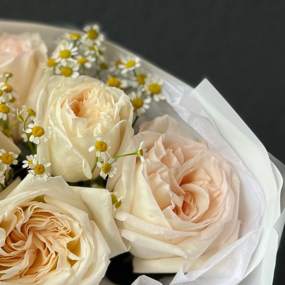 пионовидная роза white o’hara – 5 шт.Танацетум – 3 шт.декоративная упаковка – 1 шт.Атласная лента – 1 шт.