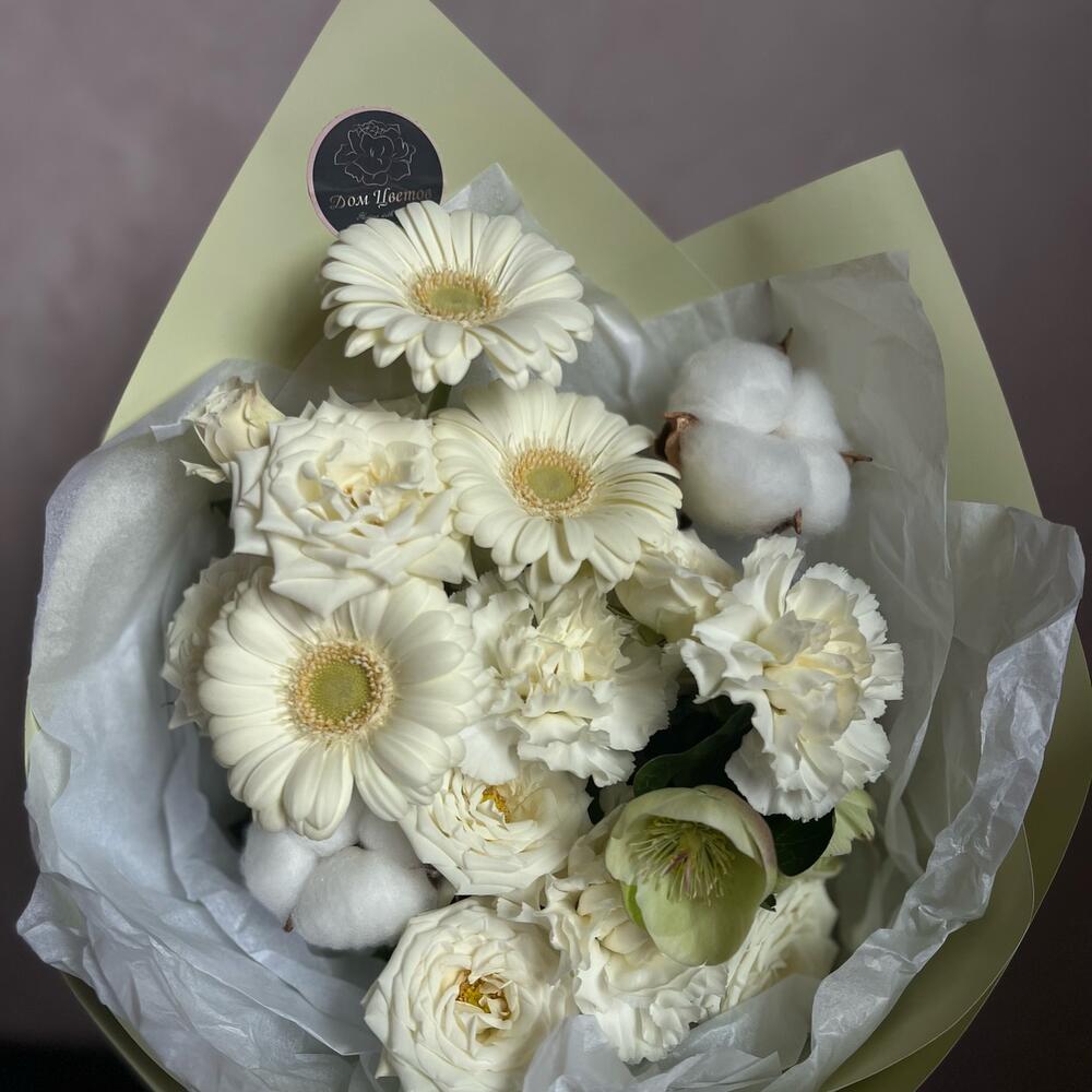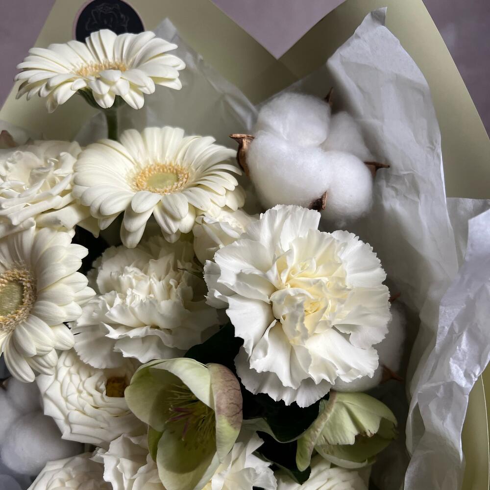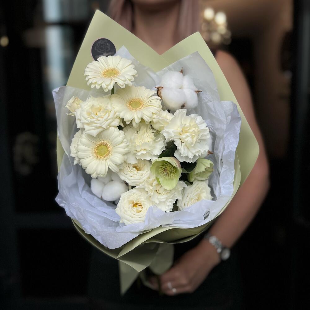 Гербера – 3 шт.Кустовая роза – 2 шт.Хелеборус – 1 шт.Гвоздика – 2 шт.Сухоцветы – 3 шт.декоративная упаковка – 1 шт.Атласная лента – 1 шт.