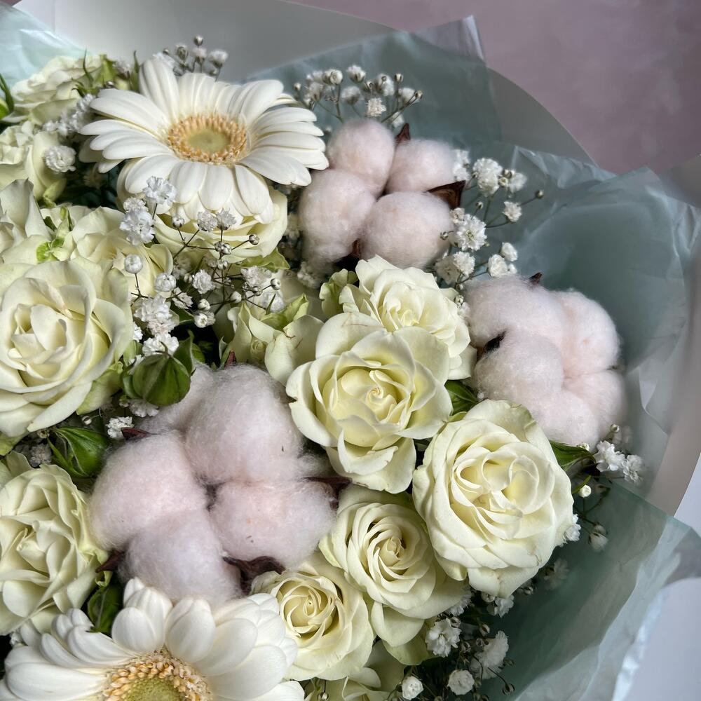 Кустовая роза – 5 шт.Гипсофила – 1 шт.Гербера – 3 шт.Хлопок – 3 шт.декоративная упаковка – 1 шт.Атласная лента – 1 шт.