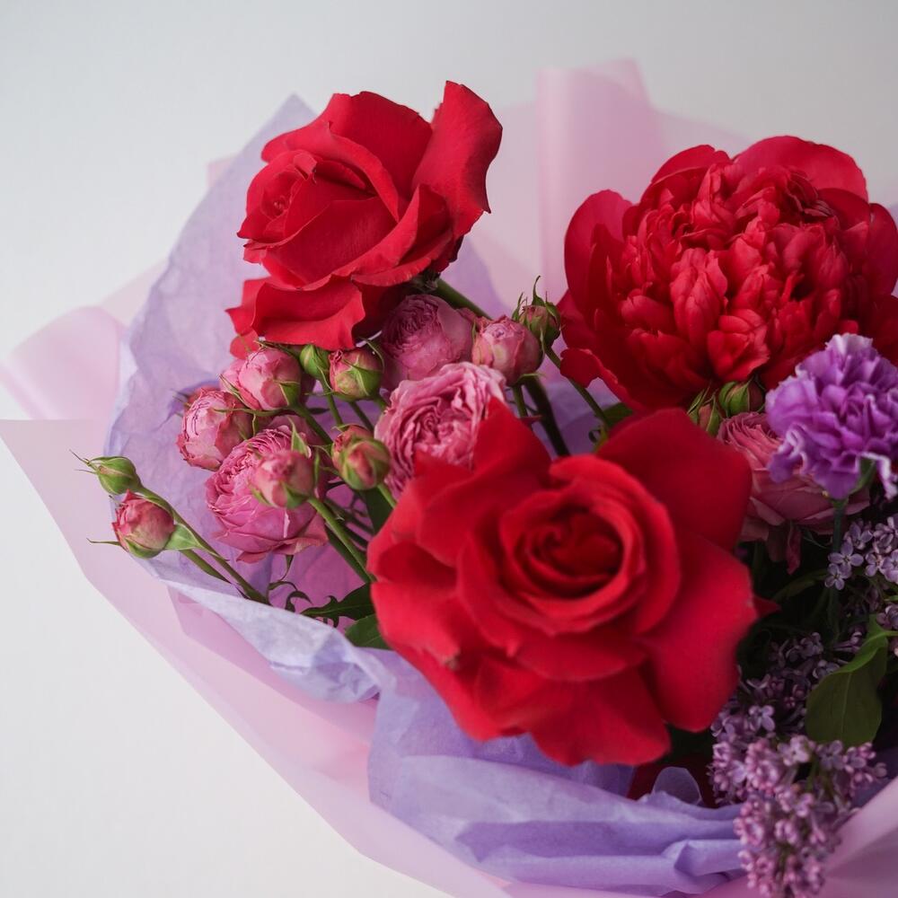 Пион – 1 шт.Роза французская – 2 шт.Роза кустовая – 2 шт.пампасная трава – 2 шт.Диантус – 4 шт.лизаантус – 2 шт.Сирень – 1 шт.Упаковка дизайнерская – 1 шт.