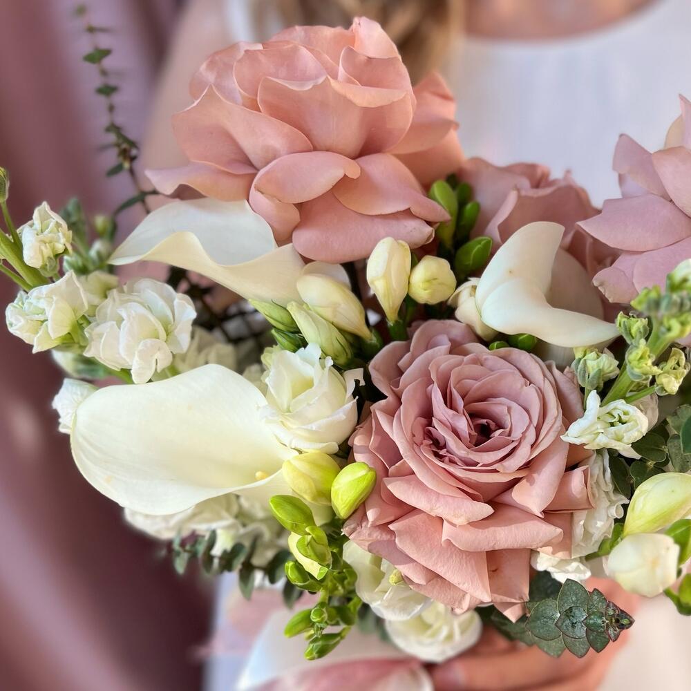 Пионовидная роза – 5 шт.Маттиола – 5 шт.Фрезия – 5 шт.Калла – 3 шт.Лизиантус – 5 шт.Эвкалипт – 3 шт.Атласная лента – 1 шт.