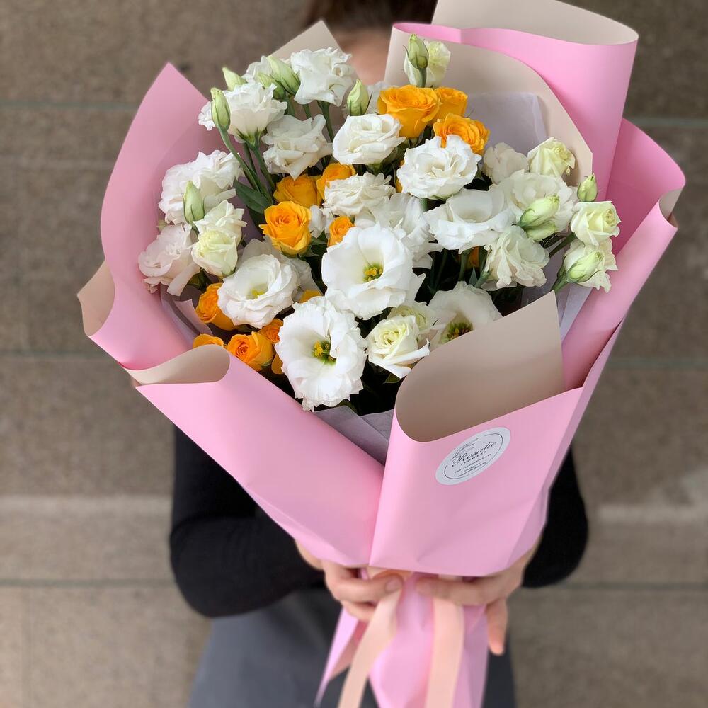 Гвоздики, Лизиантусы, Розы, Тюльпаны