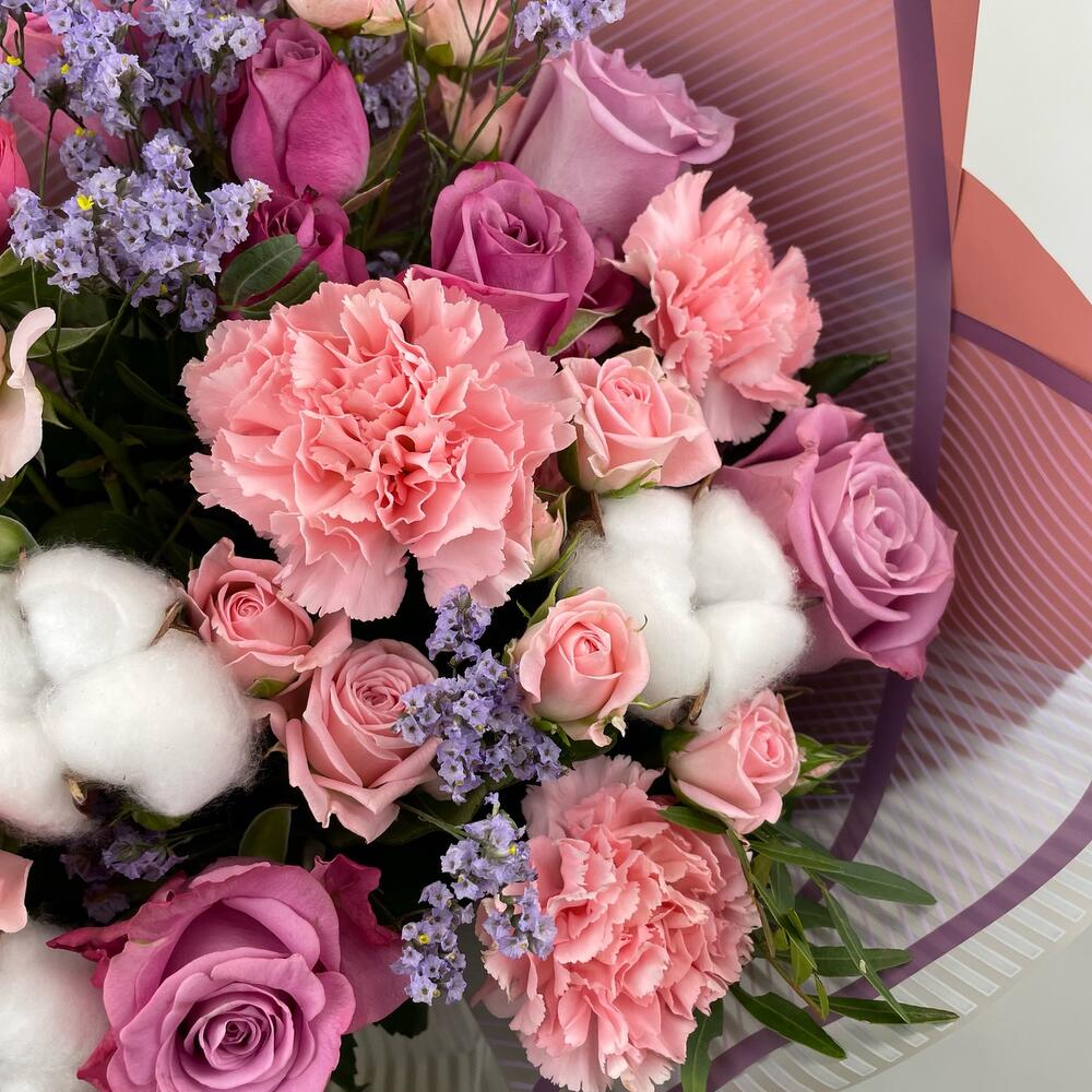 Лимониум – 2 шт.Роза – 5 шт.Кустовая роза – 5 шт.Диантус – 5 шт.Фисташка – 3 шт.Упаковка дизайнерская – 2 шт.Хлопок натуральный – 3 шт.