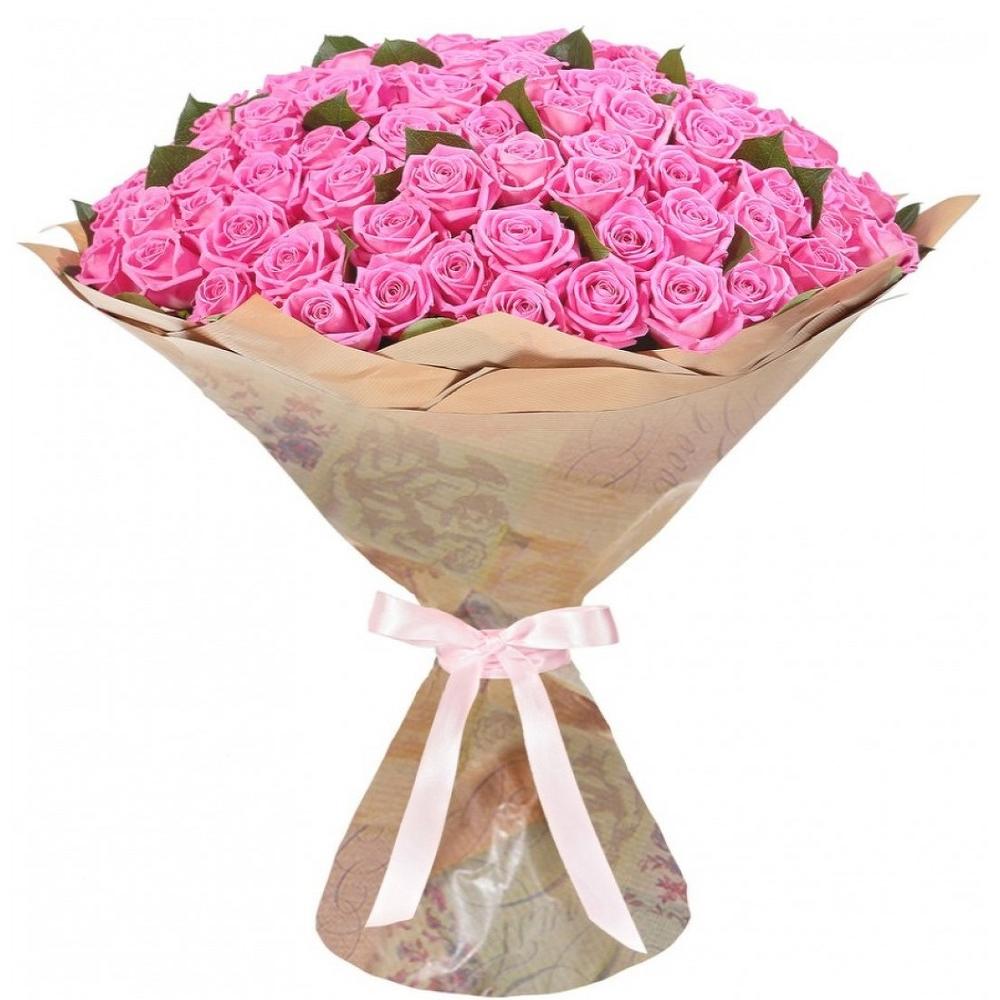 Атласная лента – 1 шт.Крафт упаковка – 1 шт.розовая роза 70 см – 101 шт.