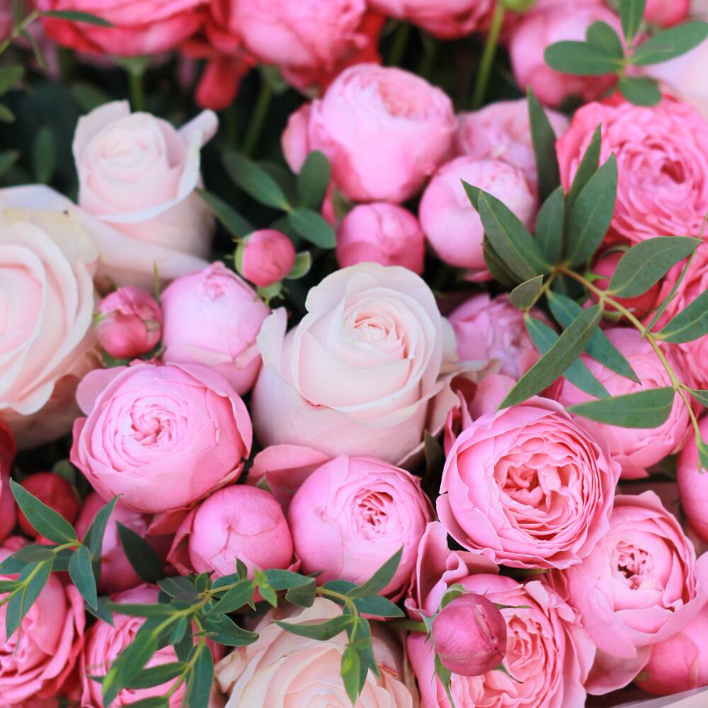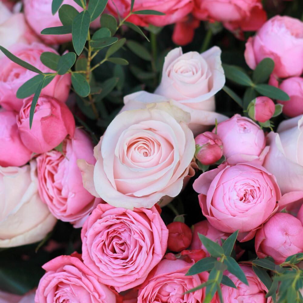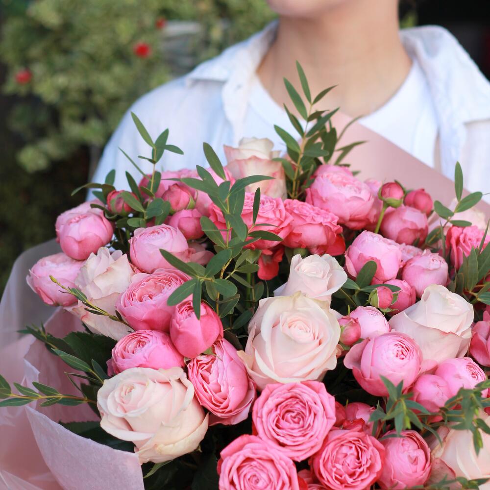 Гвоздики, Лизиантусы, Розы, Тюльпаны