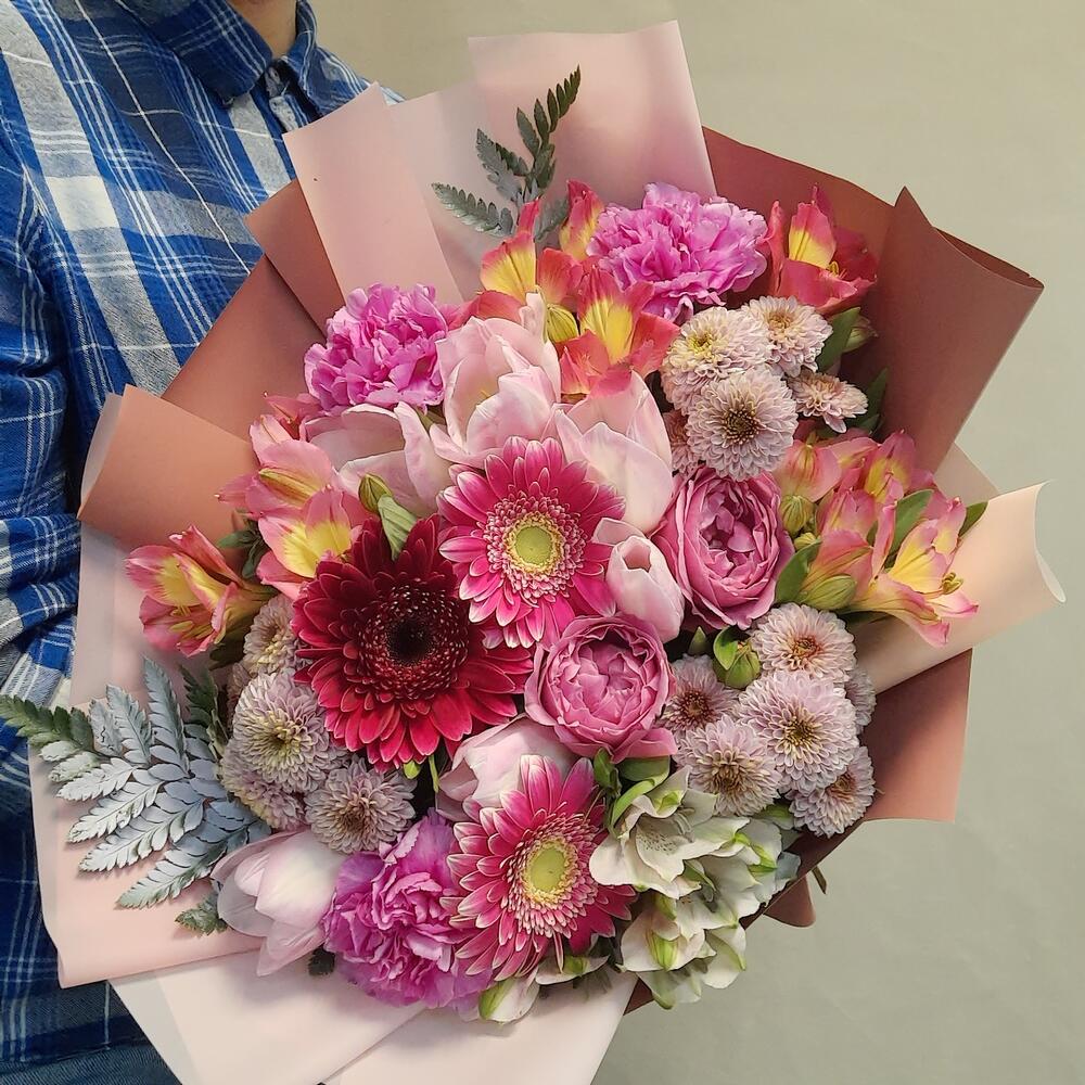 Категорий: Альстромерии, Гвоздики, Кустовые розы, Пионовидные розы, Розы, Тюльпаны