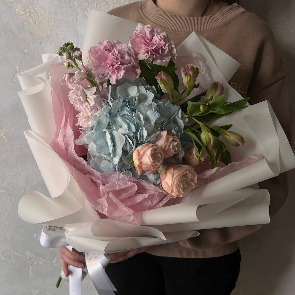Альстромерия – 1 шт.Маттиола – 1 шт.Роза кустовая – 1 шт.Гвоздика – 2 шт.Упаковка дизайнерская – 1 шт.Гортензия голубая – 1 шт.