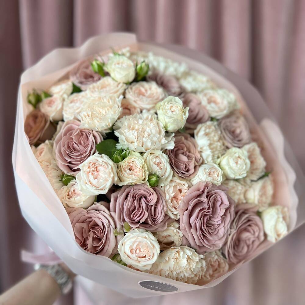 Диантус – 9 шт.Пионовидная роза – 12 шт.Атласная лента – 1 шт.Кустовая пионовидная роза – 7 шт.декоративная упаковка – 1 шт.