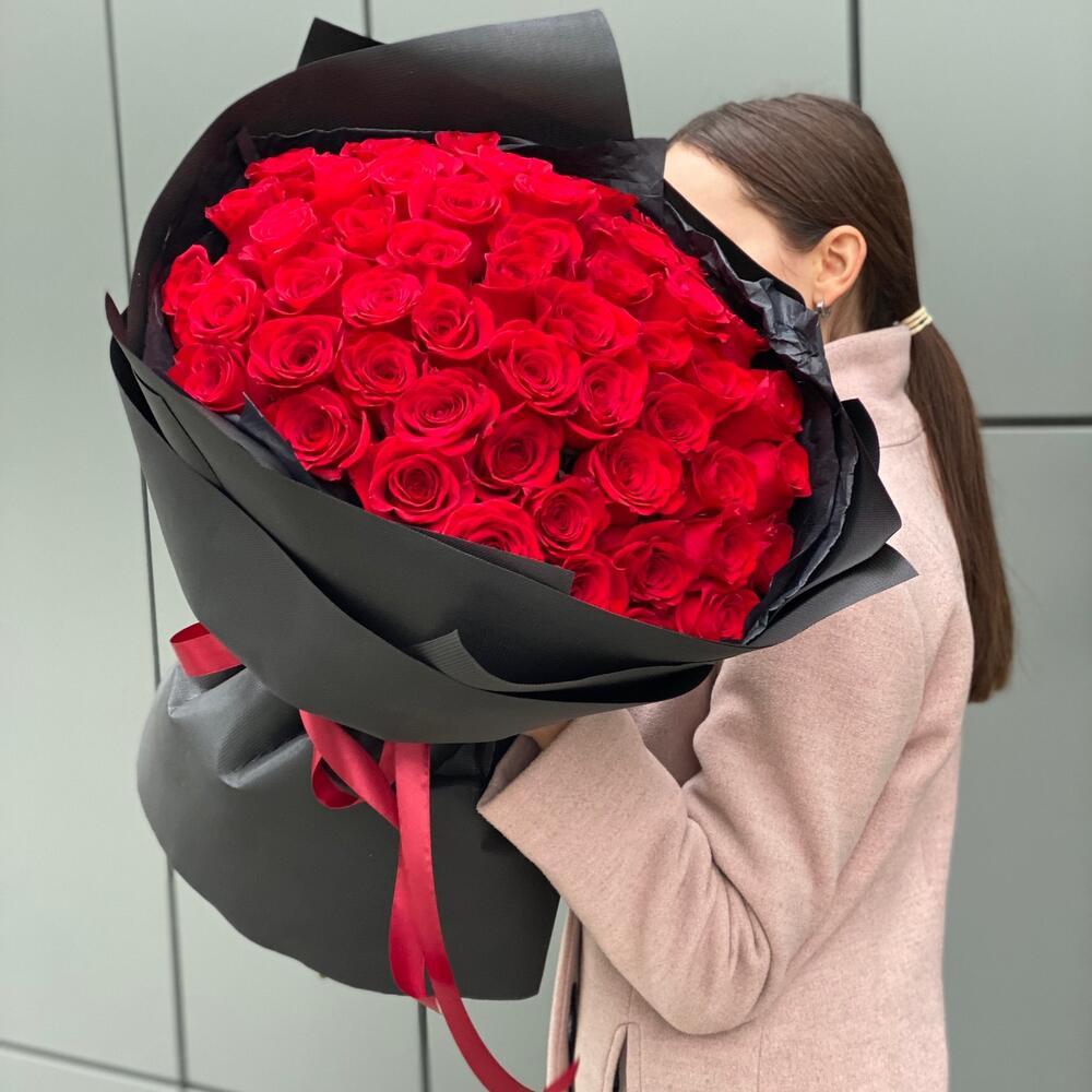 Букет из 51 красной розы в черном стильном оформлении!
