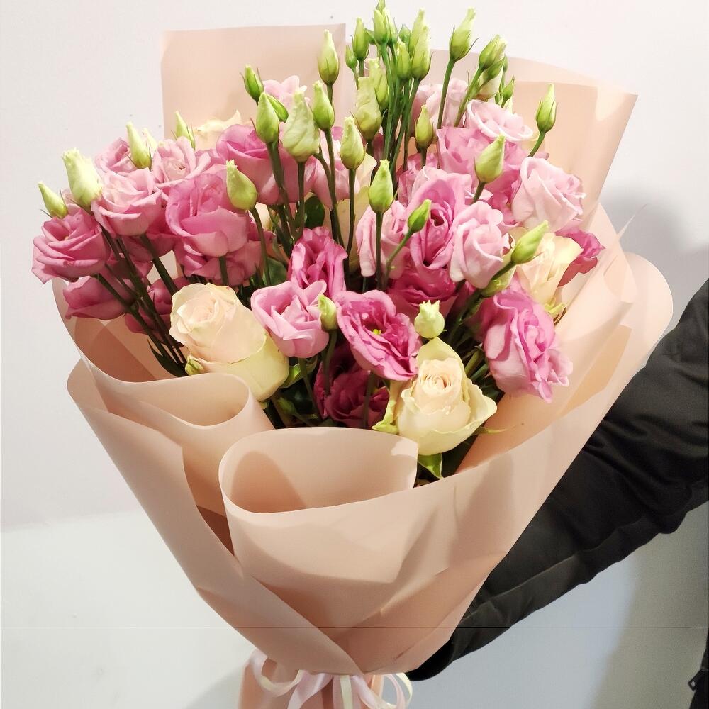 Состав: роза кремовая – 6 шт, эустома розовая- 5 веток.