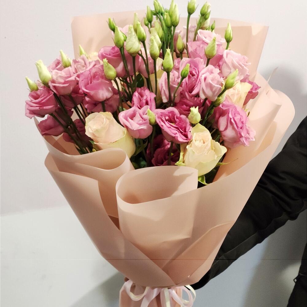 Роза кремовая – 6 шт. эустома розовая – 5 шт. оформление калька – 1 шт.