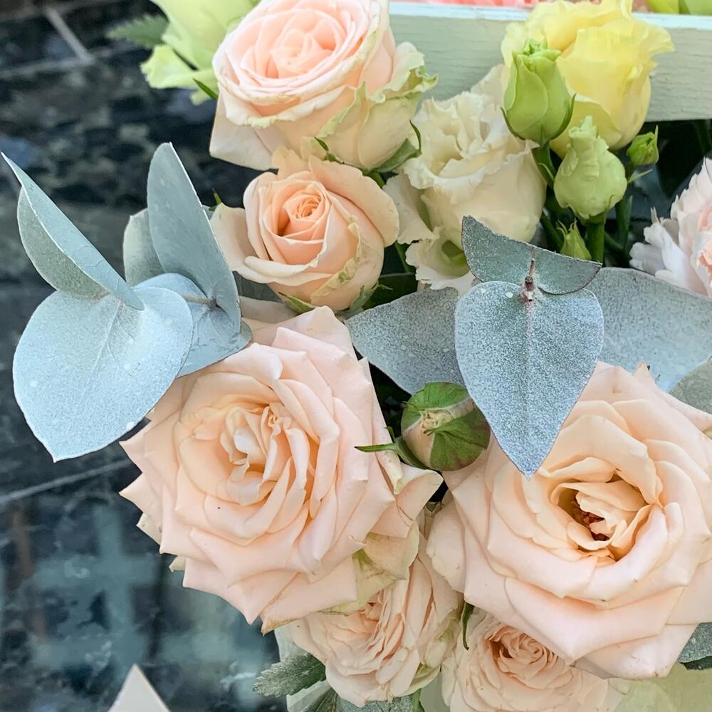 “Атлас☁️” – цветочная композиция с зефиром в деревянном ящике
