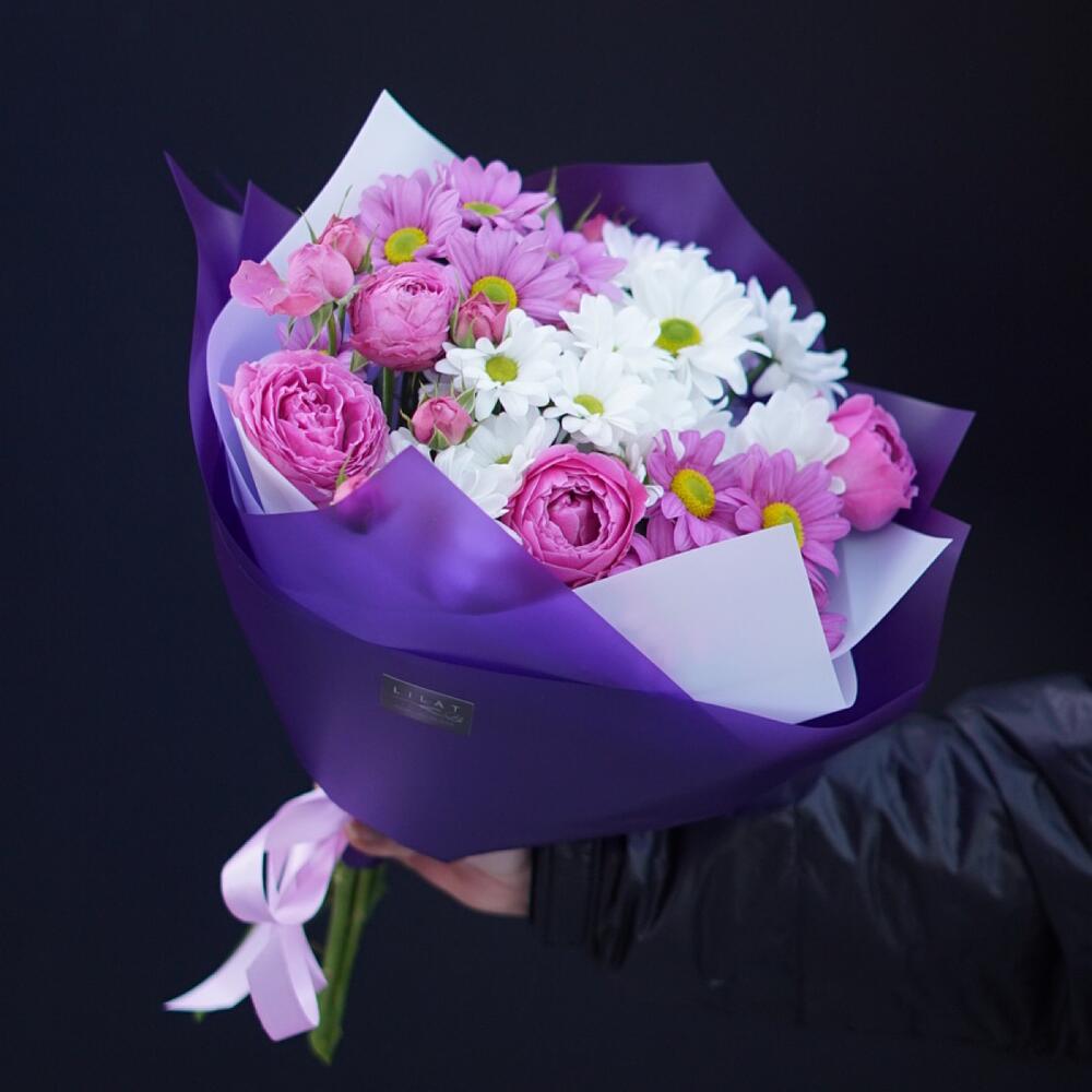 Альстромерии, Гвоздики, Кустовые розы, Лизиантусы, Розы, Хризантемы