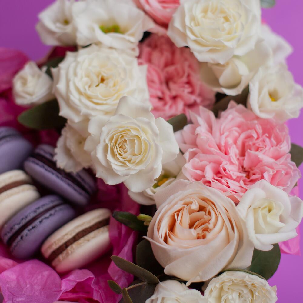 Макарон – 5 шт.Открытка – 1 шт.Пионовидная роза – 4 шт.Кустовая роза – 3 шт.