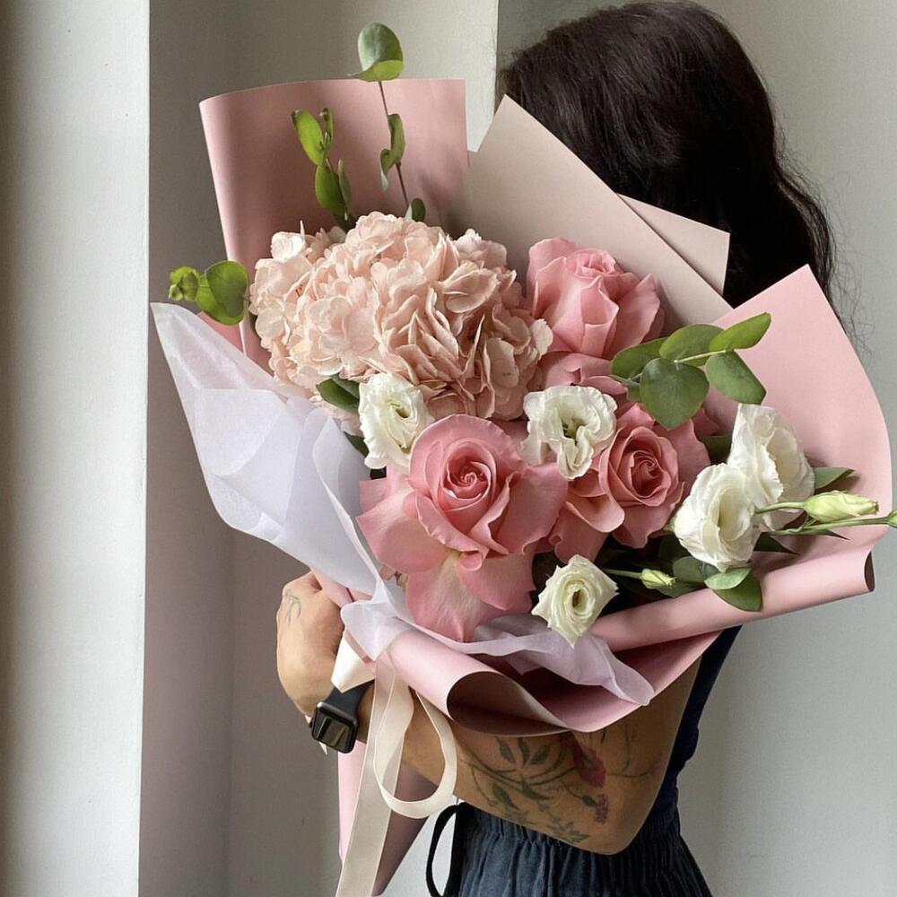 Альстромерии, Гортензии, Кустовые розы, Лизиантусы, Розы, Хризантемы