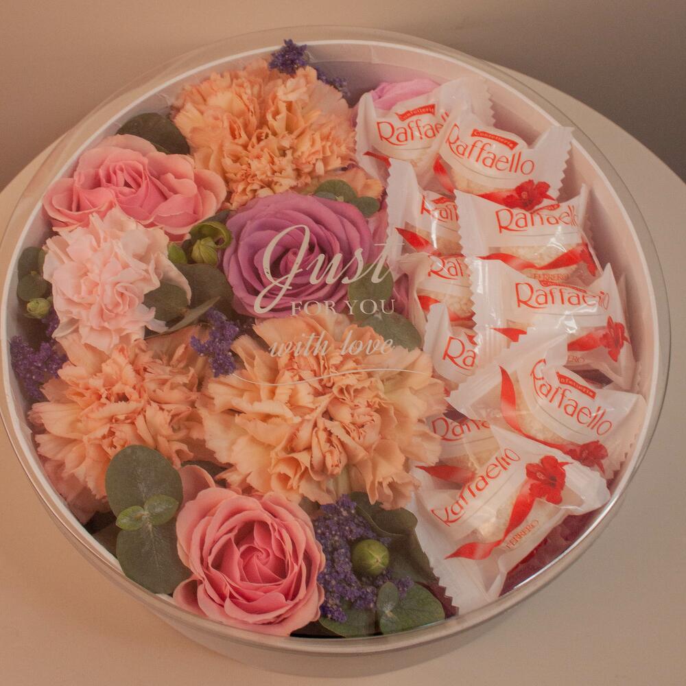 конфеты raffoello – 11 шт. Роза – 3 шт. Гвоздика – 4 шт. Зелень – 1 шт. Лимониум – 1 шт. Эвкалипт – 1 шт. Коробка – 1 шт. Оазис – 1 шт.