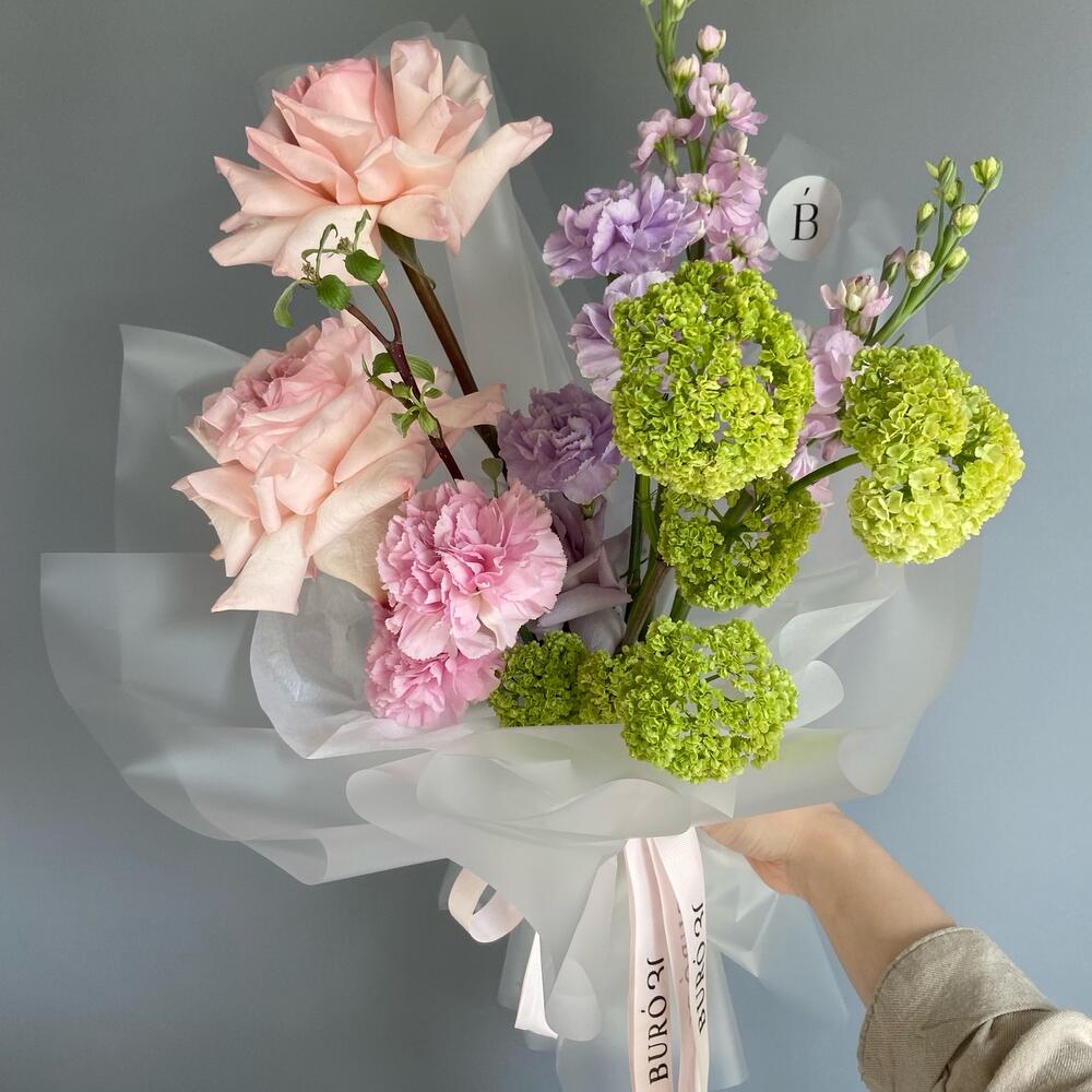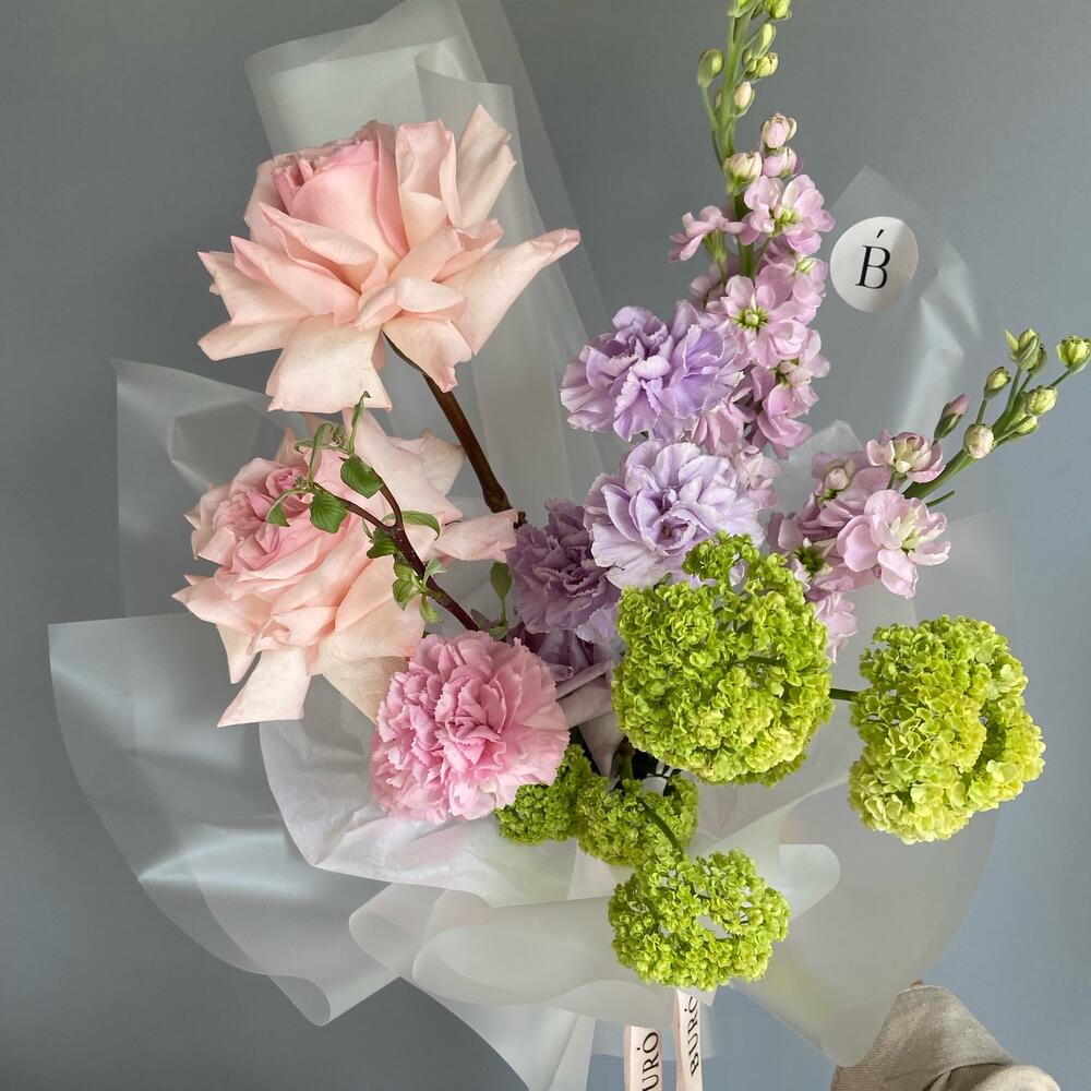Pink O’Hara роза – 2 шт.Вибурнум – 1 шт.Диантус – 5 шт.Маттиола – 2 шт.Упаковка дизайнерская – 1 шт.Писташ – 2 шт.рекомендация по уходу – 1 шт.