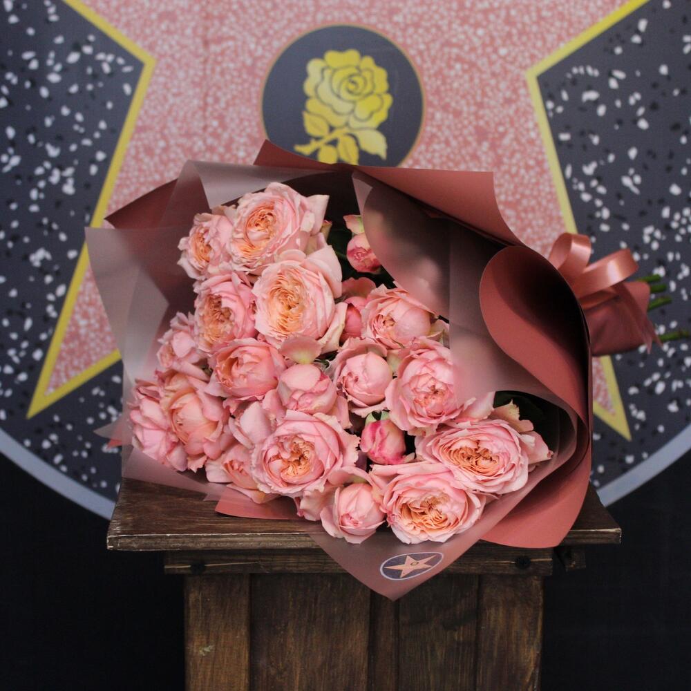 Лента атласная – 1 шт.Пленка дизайнерская – 5 шт.Роза кустовая пионовидная джульетта – 7 шт.