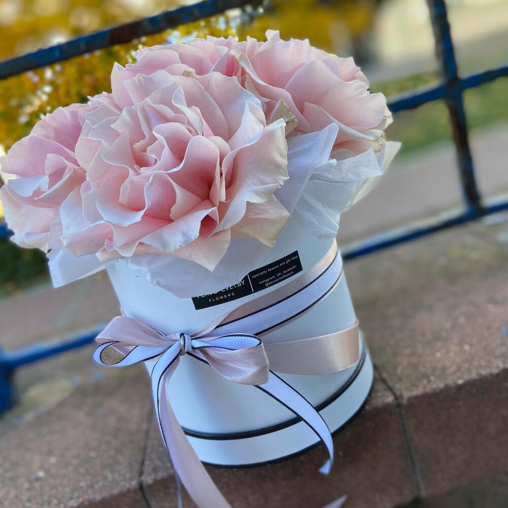 Французская роза – 5 шт. Коробка шляпная – 1 шт. Оазис флористический – 1 шт.