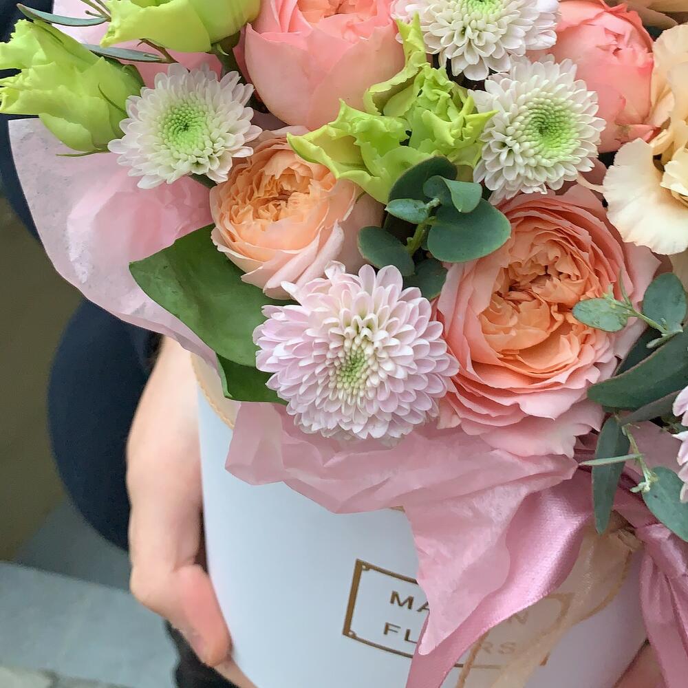 Роза кустовая пионовидная – 1 шт.Хризантема кустовая – 2 шт.Лизиантус – 1 шт.Эвкалипт – 3 шт.Тишью – 1 шт.Коробка шляпная – 1 шт.