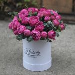 Роза кустовая пионовидная – 7 шт.Эвкалипт – 3 шт.Оазис флористический – 2 шт.Шляпная коробка – 1 шт.