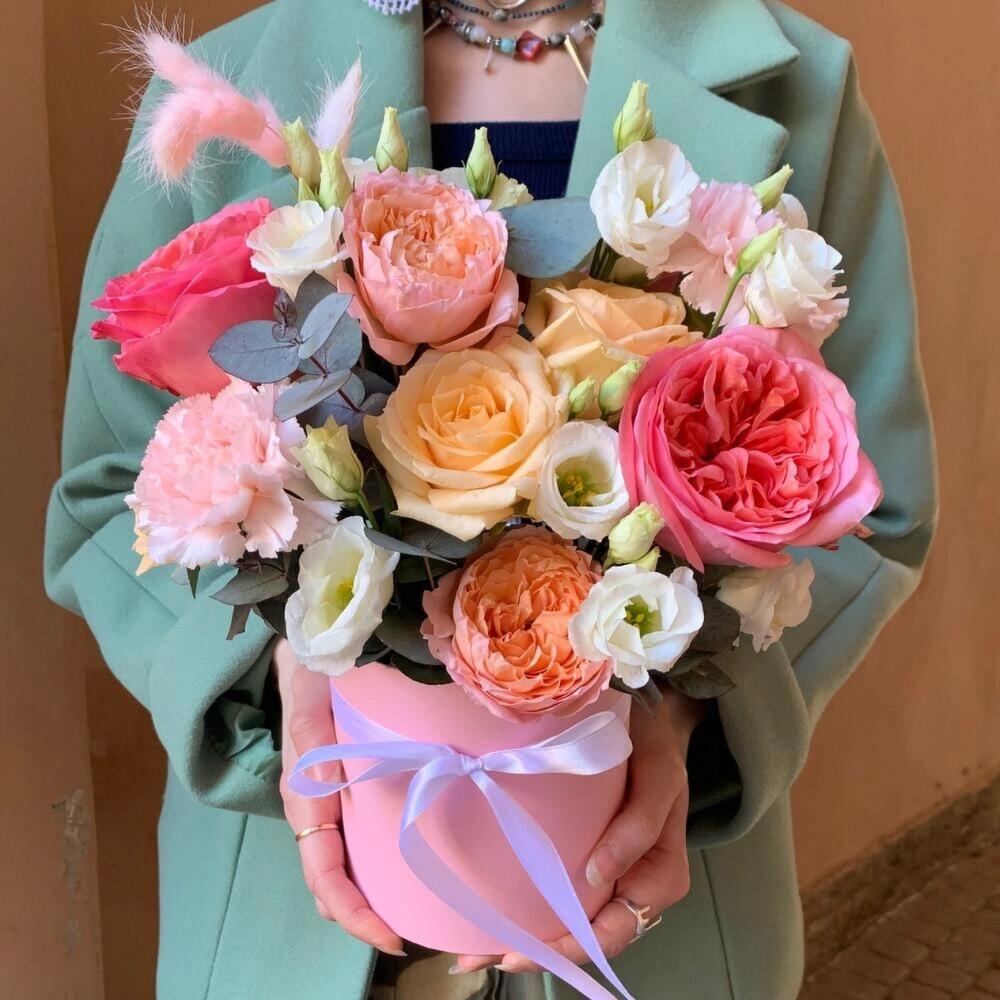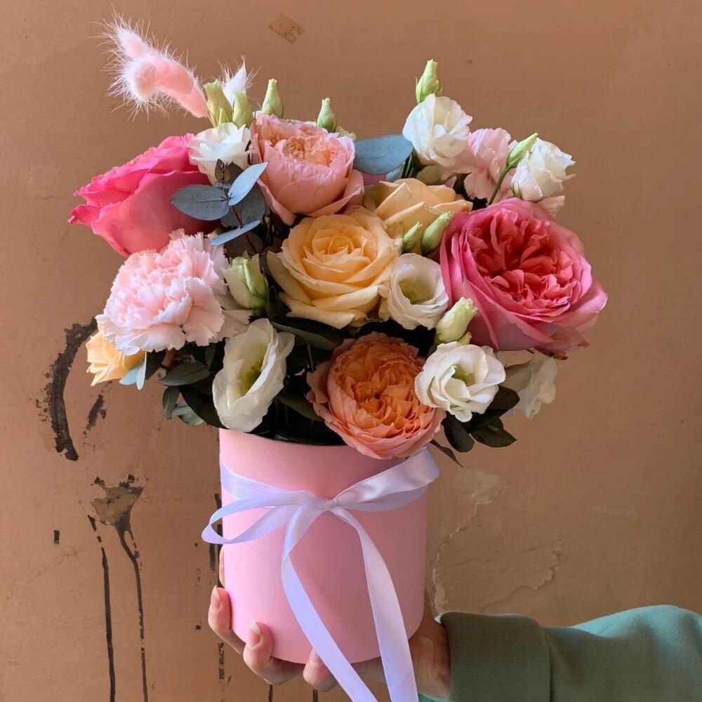 Эвкалипт – 2 шт.Гвоздика розовая – 3 шт.Коробка шляпная – 1 шт.Оазис – 1 шт.Лизиантус белый – 1 шт.джульетта – 1 шт.Лагурус розовый – 3 шт.роза пинк экспрешн – 3 шт.роза персиковая россия – 4 шт.