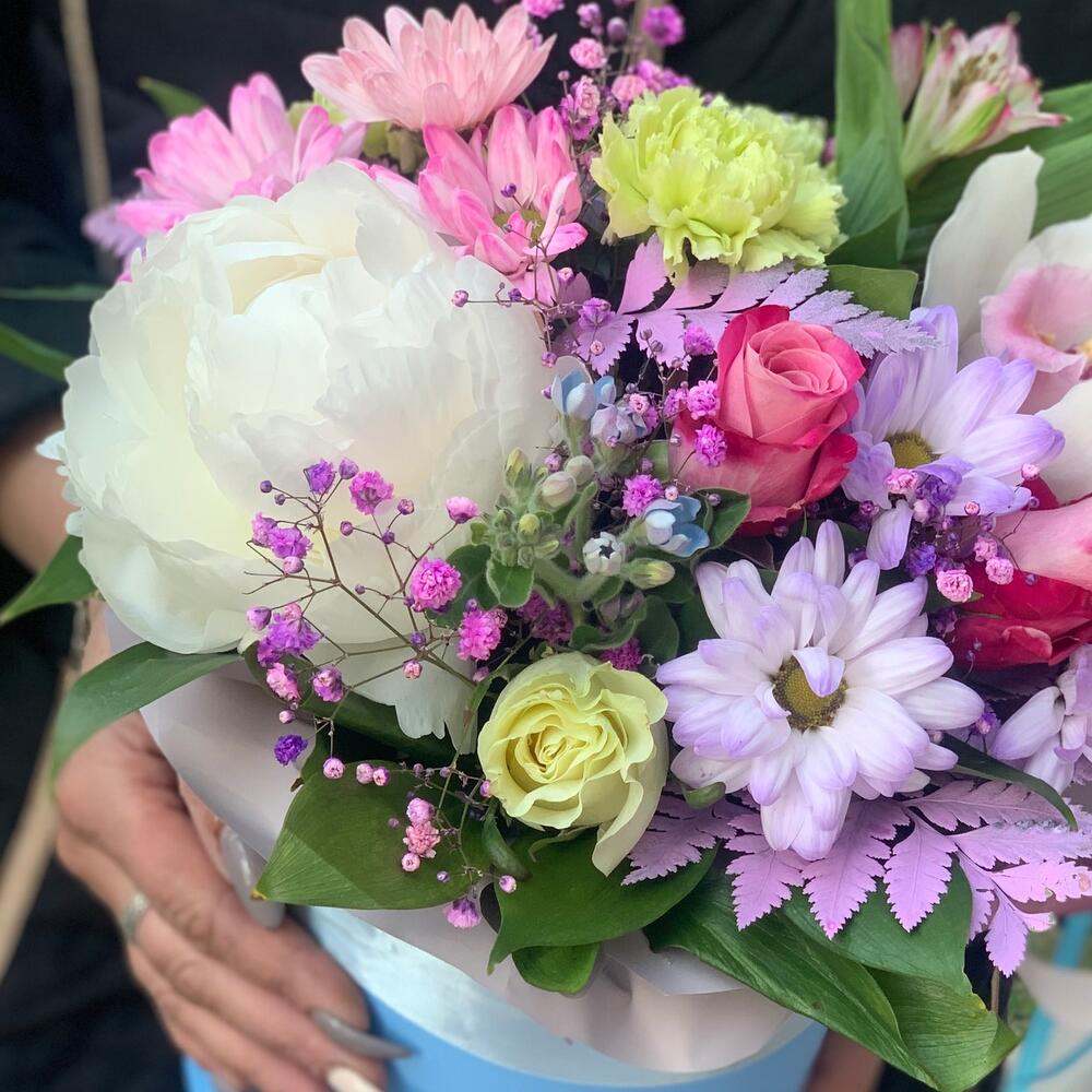 Пион – 1 шт.Роза кустовая – 1 шт.Хризантема кустовая – 3 шт.Эвкалипт – 1 шт.Роза – 1 шт.Гвоздика – 3 шт.Незабудка – 1 шт.Шляпная коробка с лентами – 1 шт.