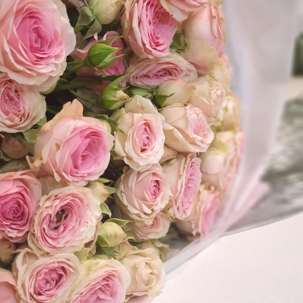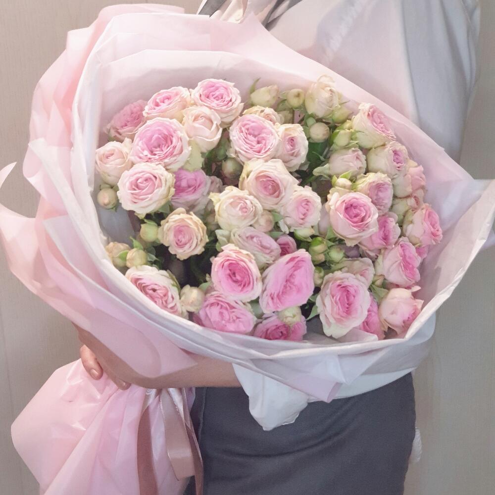 Лента атласная – 1 шт.Роза кустовая пионовидная – 7 шт.Пленка матовая – 1 шт.Открыточка с вашими пожеланиями – 1 шт.Тишью белое – 4 шт.любовь флориста (бесплатно) – 1 шт.