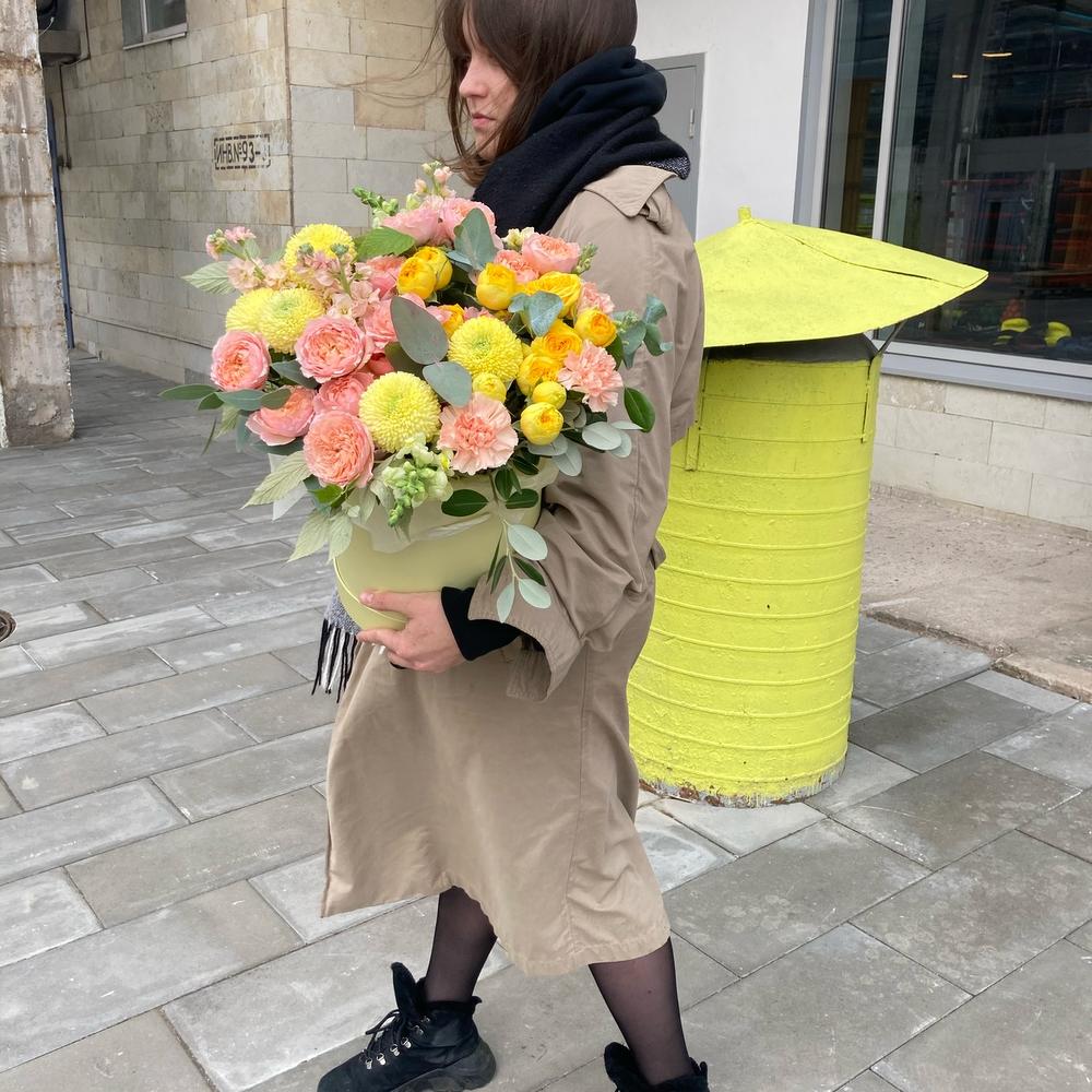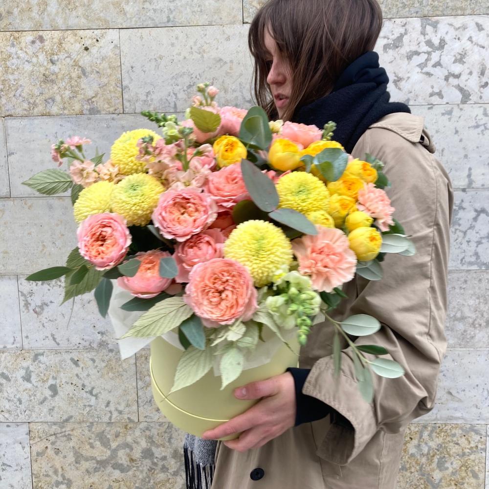 Роза пионовидная кустовая – 7 шт.Хризантема – 5 шт.Маттиола – 7 шт.Львиный зев – 3 шт.Эвкалипт – 7 шт.Ветки малины – 3 шт.Тишью – 2 шт.Шляпная коробка – 1 шт.Оазис флористический – 1 шт.