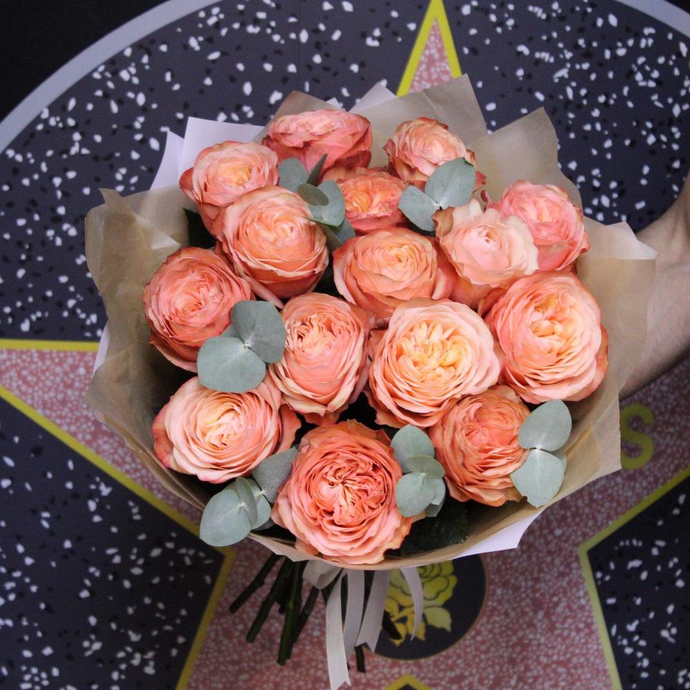 Роза пионовидная – 15 шт.Эвкалипт – 3 шт.Пленка дизайнерская – 3 шт.