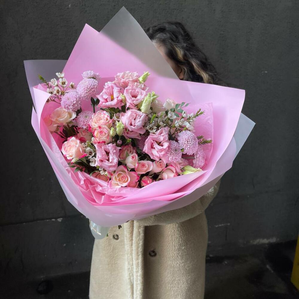 Малиновый зефир: розы, эустома и хризантема