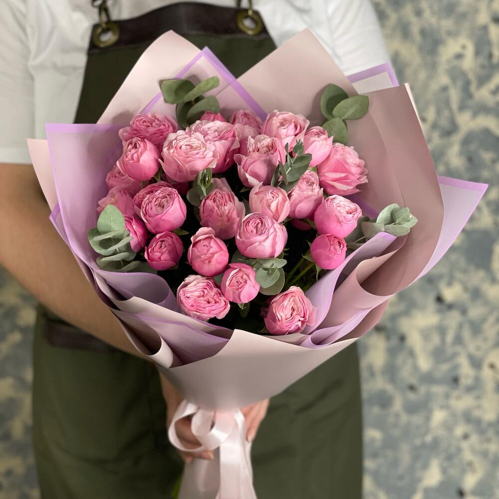 роза кустовая пионовидная сильва пинк – 7 шт.Эвкалипт – 3 шт.Пленка матовая – 4 шт.Лента атласная – 2 шт.