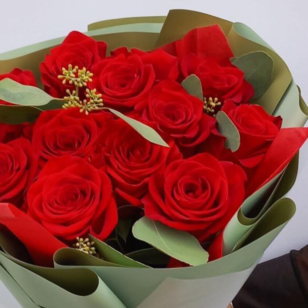Роза Эквадор – 11 шт.Эвкалипт – 1 шт.Упаковка дизайнерская – 2 шт.Лента атласная – 1 шт.