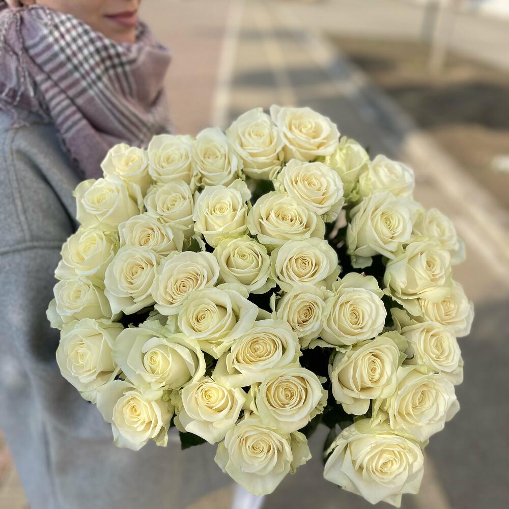 Роза белая – 35 шт. Атласная лента – 1 шт.