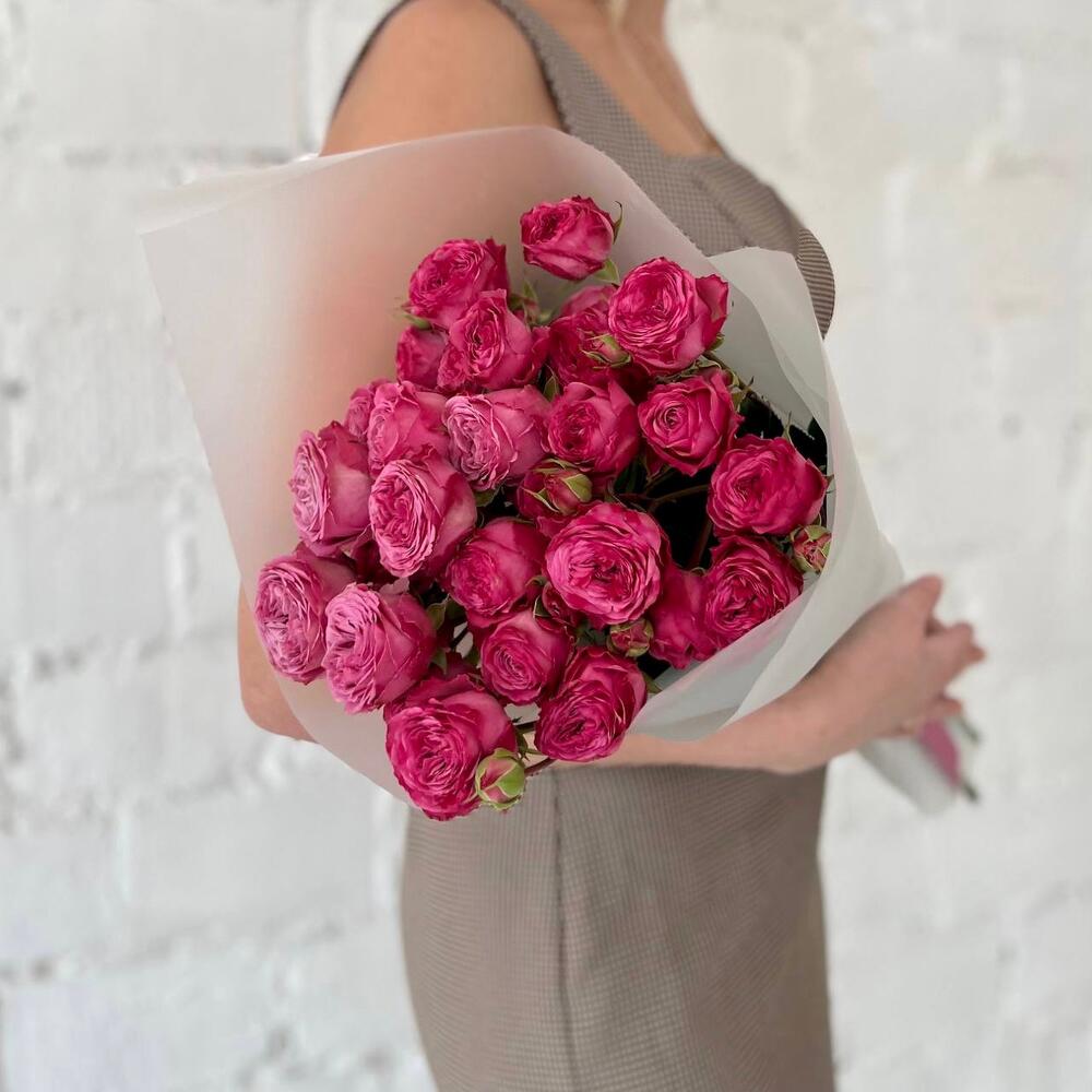 Роскошные пионовидные кустовые розы в дизайнерской упаковке