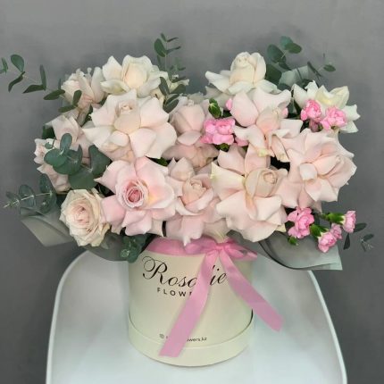 Эвкалипт – 5 шт. Лента атласная – 2 шт. Коробка шляпная – 1 шт. Фисташка – 2 шт. Хамелациум – 5 шт. Роза голландия – 25 шт. Декор – 2 шт. Оазис флористический – 2 шт.