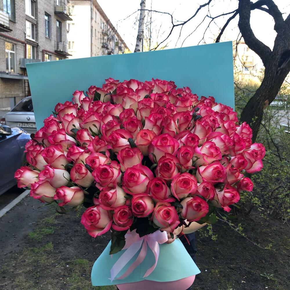 101 роза 60 см бело розовыеШикарные Ароматные розыВ стильной упаковке фоамиранОчень популярная упаковкаСтойкость отличная при правильном уходе!Стойкость до 14 дней !’доставим быстра чётко и достойно!