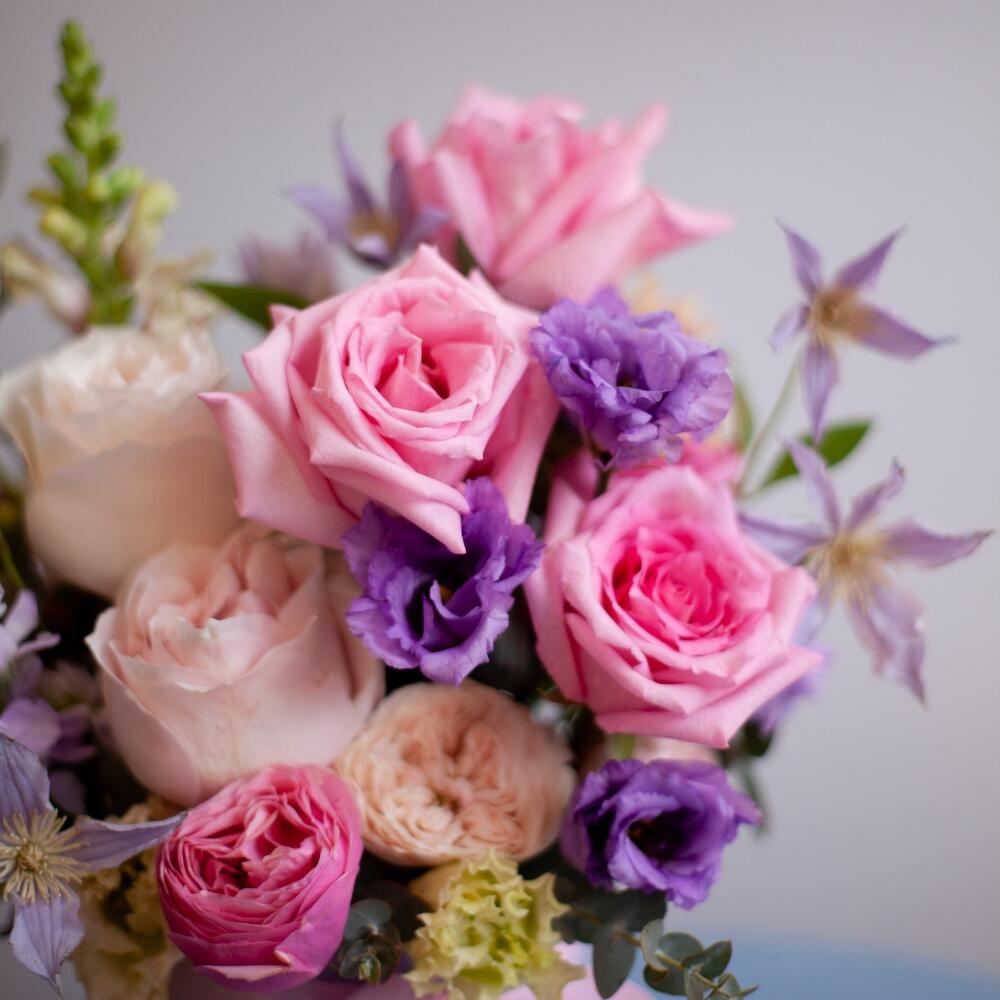Шляпная коробка с цветами в сиренево- розовой гамме