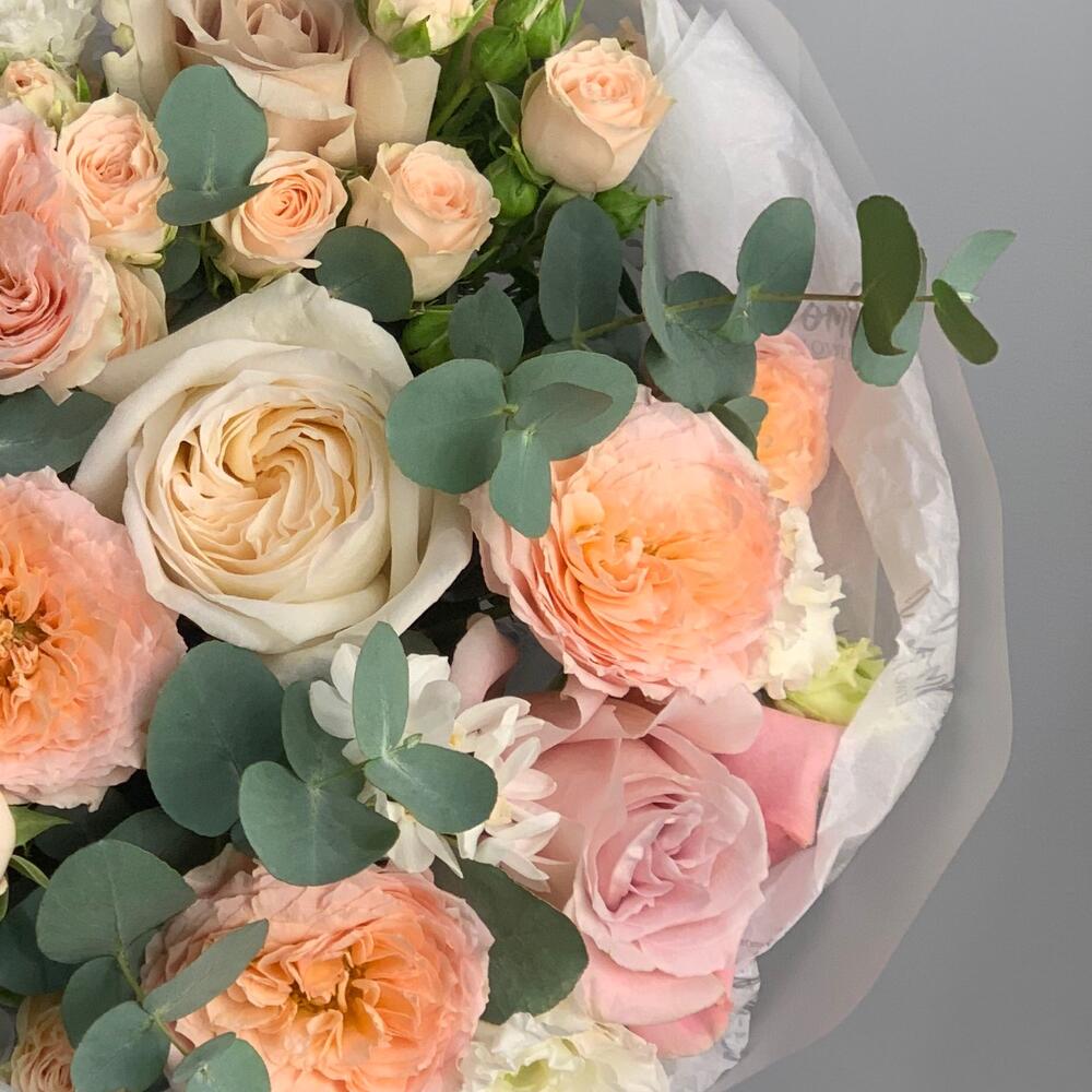 Альстромерии, Гвоздики, Кустовые розы, Лизиантусы, Розы, Хризантемы
