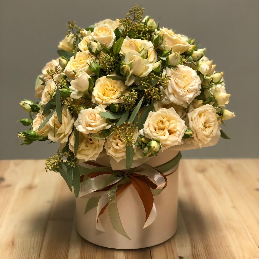 Роза кустовая – 11 шт.Эвкалипт – 3 шт.Шляпная коробка с лентами – 1 шт.Оазис флористический – 1 шт.Упаковка дизайнерская – 1 шт.