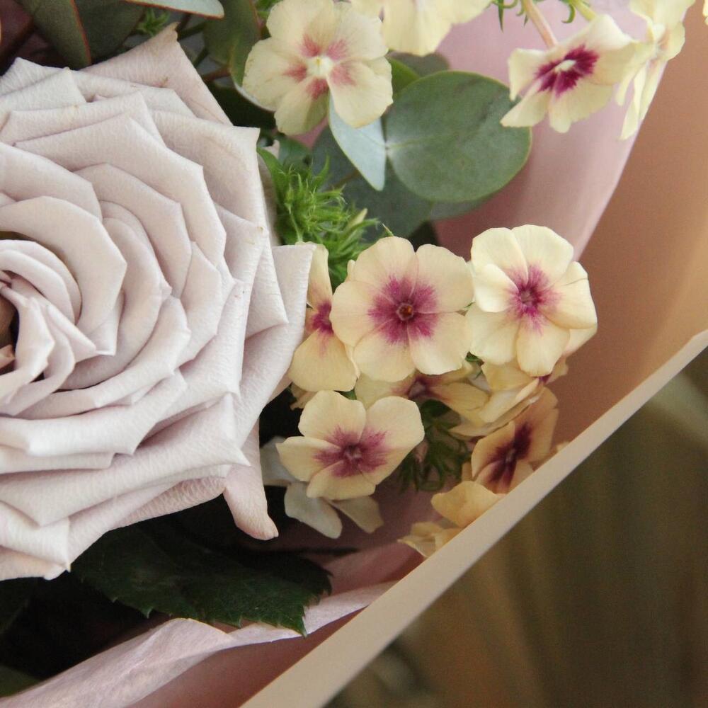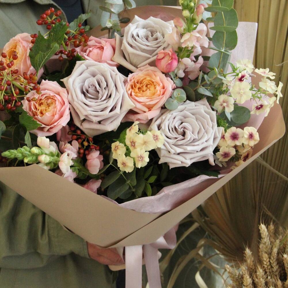 Альстромерии, Кустовые розы, Лизиантусы, Пионовидные розы, Розы, Ромашки