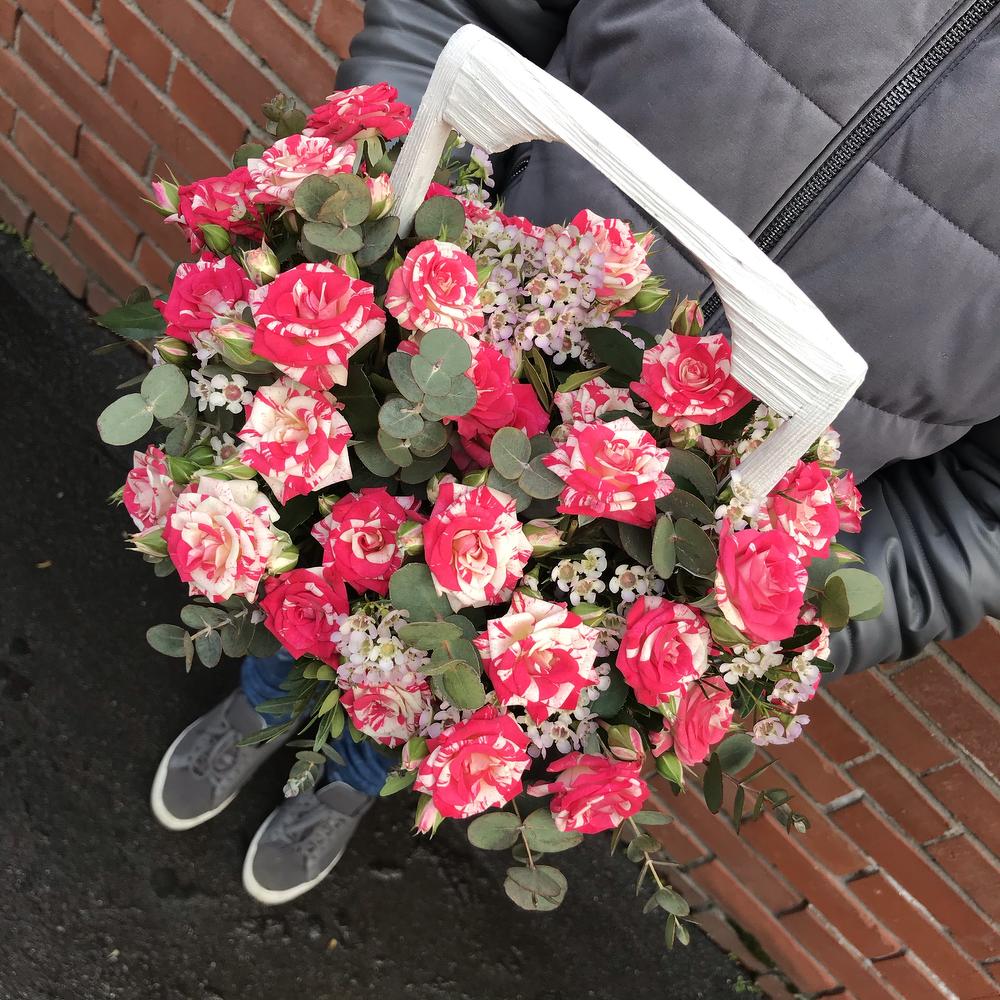 роза кустовая мраморная – 7 шт.Ваксфлауэр – 4 шт.Эвкалипт – 4 шт.Ящик деревянный – 1 шт.