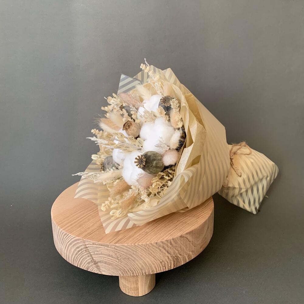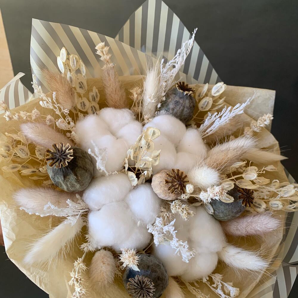 Хлопок – 5 шт.мак декоративный – 5 шт.Лагурус – 15 шт.шандра – 2 шт.Лимониум – 1 шт.Ярутка – 5 шт.Тишью – 1 шт.Пленка матовая – 1 шт.бечевка натуральная – 1 шт.