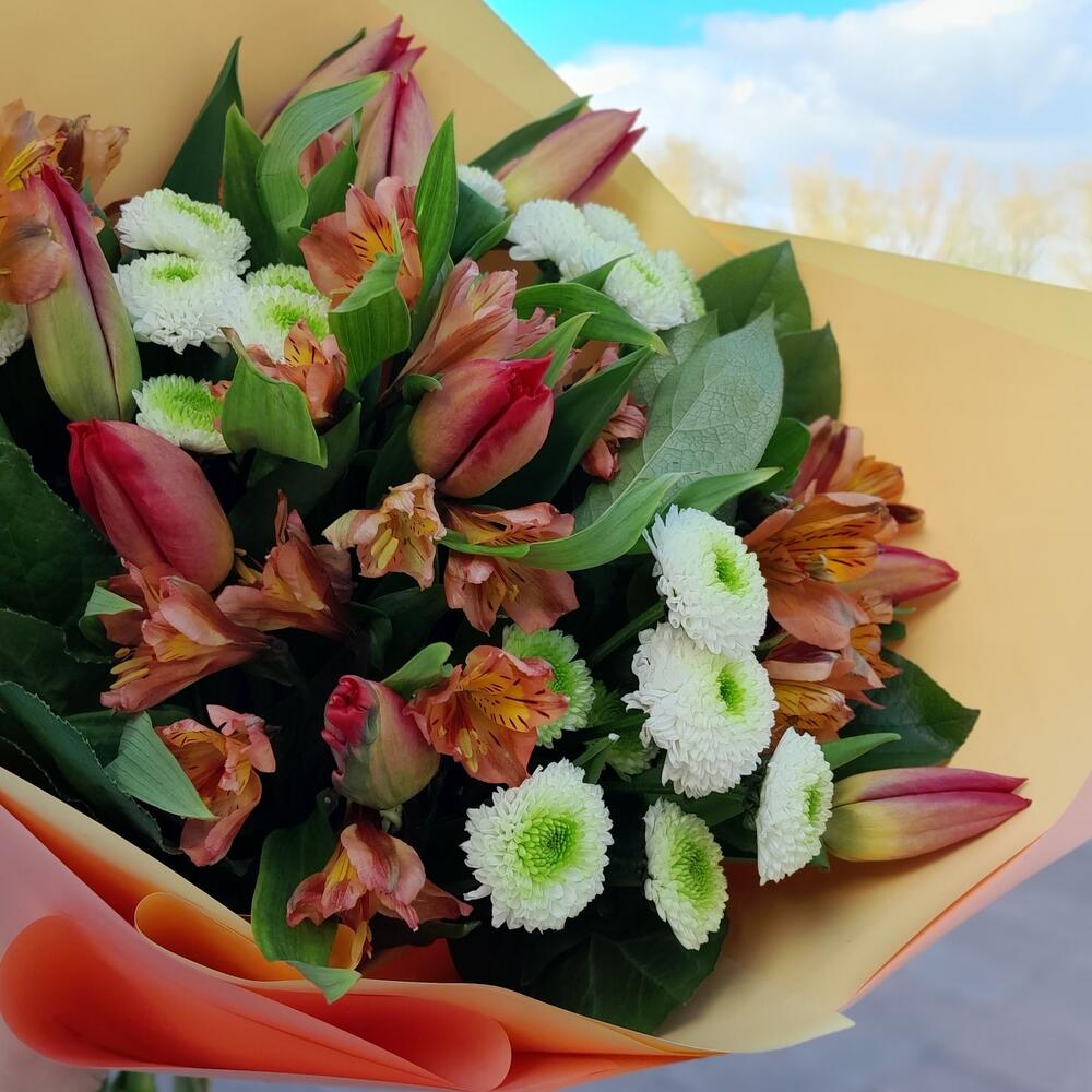 Альстромерия – 7 шт.Салал – 3 шт.Тюльпан – 9 шт.Лента атласная – 2 шт.Сантини – 3 шт.Упаковка дизайнерская – 3 шт.