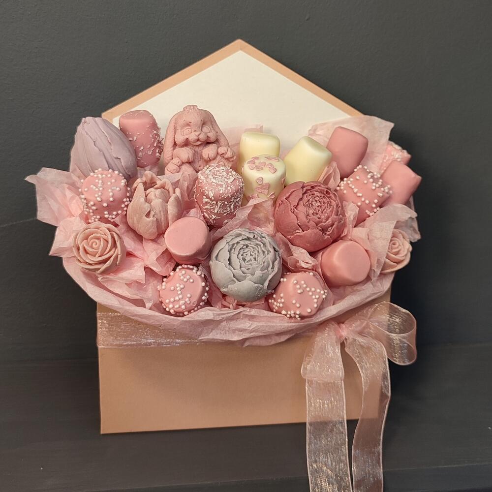 пион из белого бельгийского шоколада – 2 шт.тюльпан из бельгийского шоколада – 2 шт.маршмеллоу в шоколаде – 15 шт.конверт картонный – 1 шт.